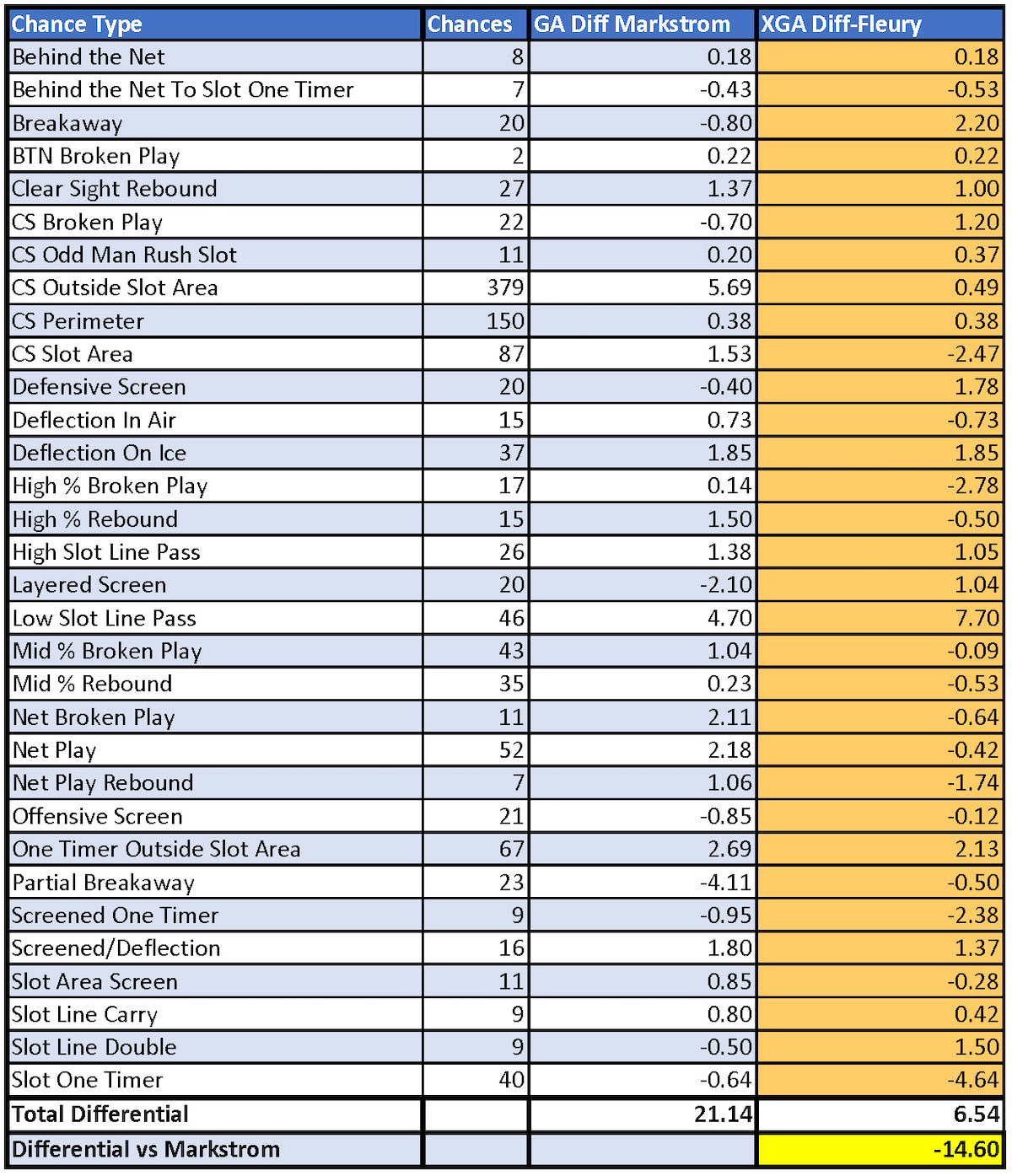 Statistical comparison table showing GAA differentials by chance type for Markstrom vs Fleury goaltender swap analysis by David Hutchison | Oct 9, 2020 Submit a Comment Cancel replyYou must be logged in to post a comment.