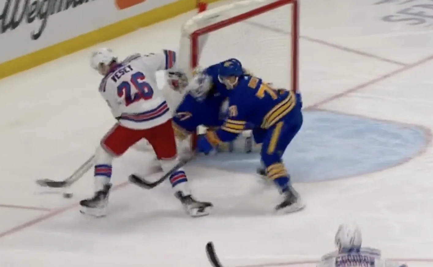 While we probably gave away some of the answers from the first screencap in terms of what was coming next, what do you make of Levi’s decision to get back up to his skates off that right post as the Rangers players gets the puck in the slot and starts to spin?