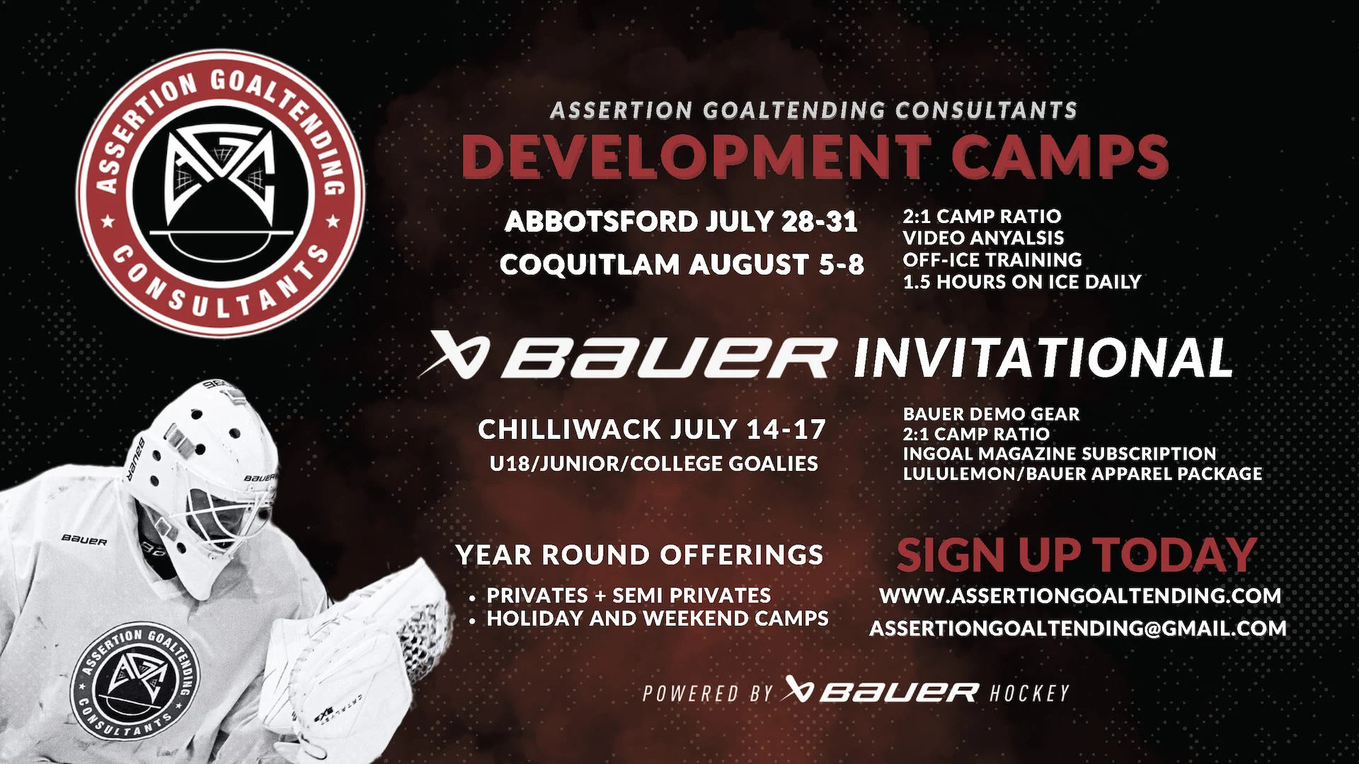 Assertion Goaltending is pleased to offer our Coquitlam Development Camp from August 5 – August 8 at Planet Ice in Coquitlam, British Columbia.