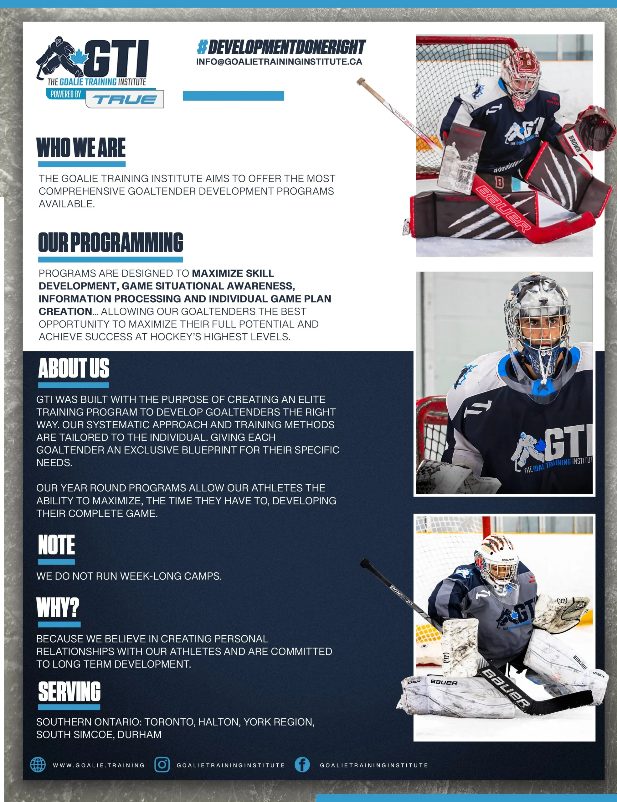 The Goalie Training Institute offers the most comprehensive goaltender development programs available. Programs are designed to maximize skill development and allow goaltenders the best opportunity to achieve success at hockey’s highest levels.