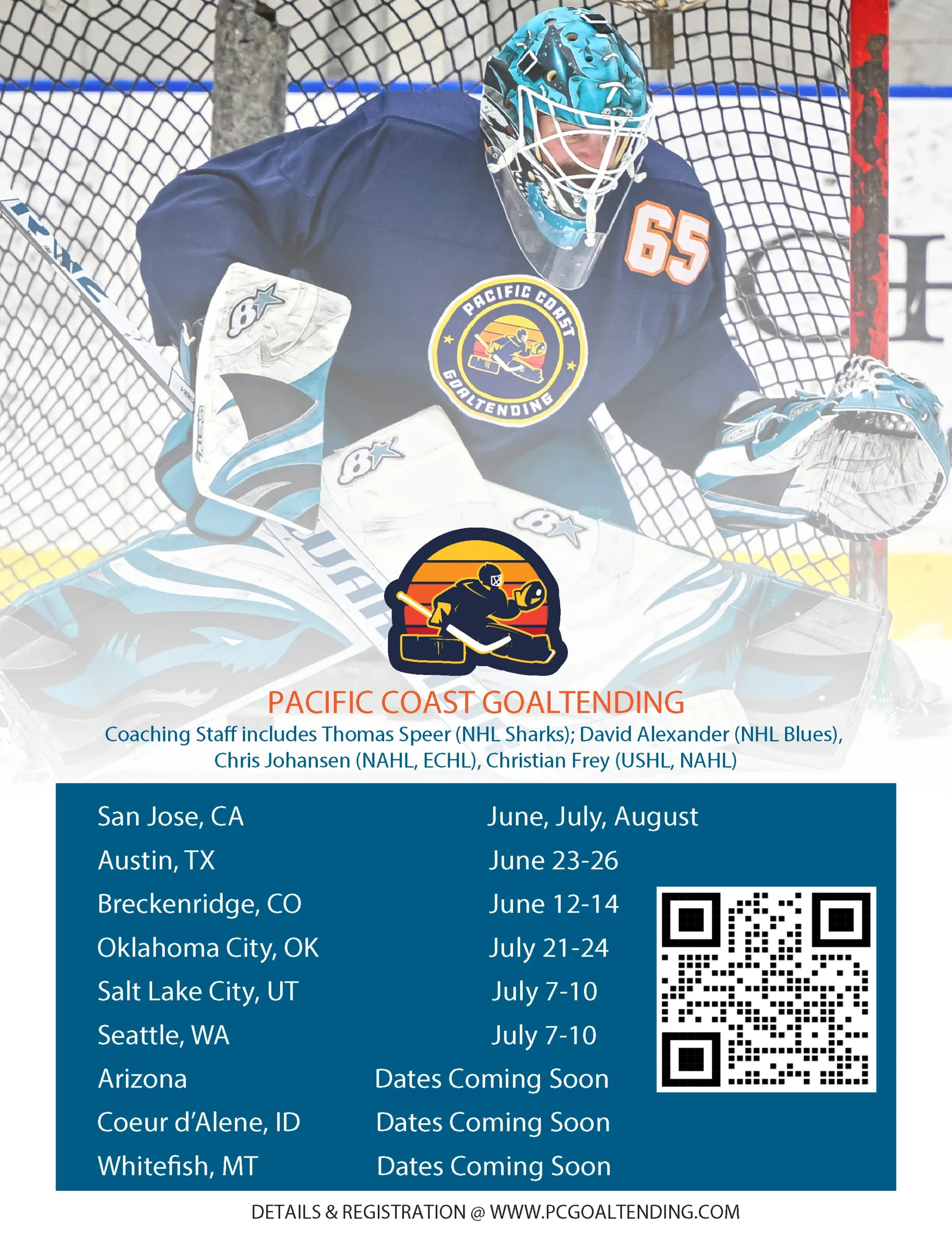 San Jose, CA – June 17-20 / July 15-18 / July 29 – Aug 1. Featuring NHL Goaltending Coach Thomas Speer, ECHL/NAHL Coach Chris Johansen, USHL/NAHL Coach Christian Frey.