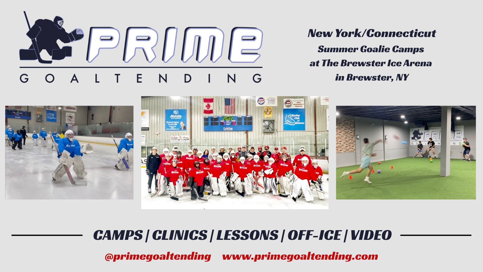 Prime Goaltending, based out of Brewster NY, offers year-round goalie camps, clinics, private lessons, off-ice training & video coaching.