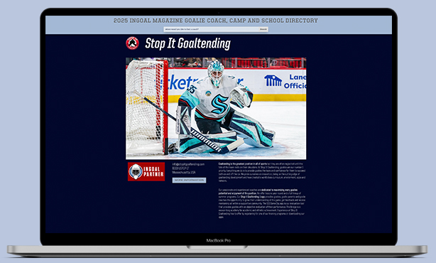 Seattle Kraken goalie in butterfly position making a save, wearing teal and white gear, on the Stop It Goaltending website February 10, 2025 · David Hutchison